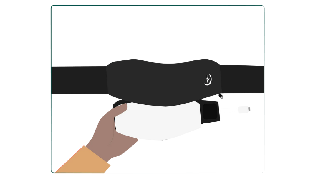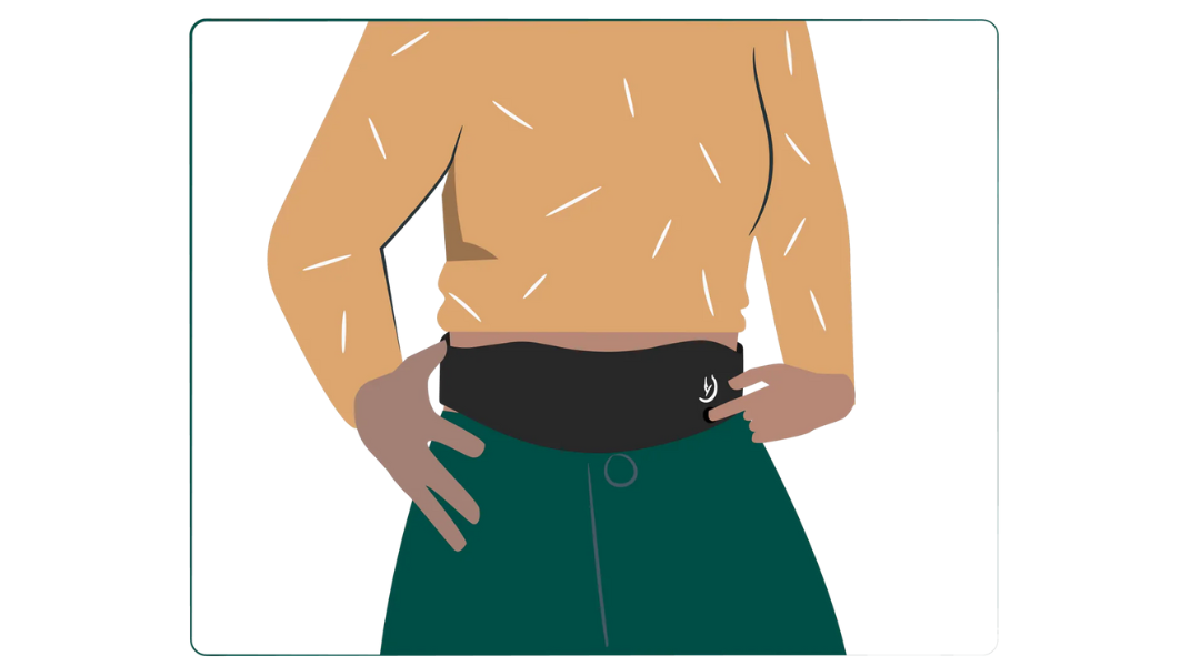 Je place la ceinture sur mes hanches et j’appuie 4 secondes sur le bouton du boîtier placé à l’avant de la ceinture juste sous le logo brodé.